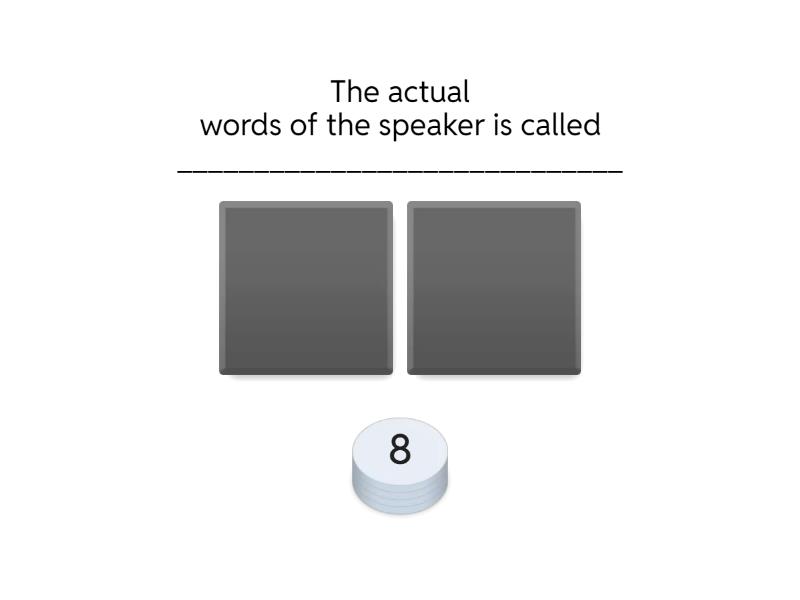 1) The actual words of the speaker is called _____________________________ a) Direct Speech b) Indirect Speech 2) Which conjunction is used to in the conversion of Assertive Sentences to Indirect Speech? a) that b) if c) whether d) no conjunction is used 3) The word 'today' in direct speech is changed to __________________ in indirect speech. a) yesterday b) that day c) the previous day 4) The word 'must' in direct speech will change to _____________ in indirect speech. a) no change b) would c) had to 5) The word 'ago' in direct speech will change to ____________ indirect speech. a) before b) ahead c) behind