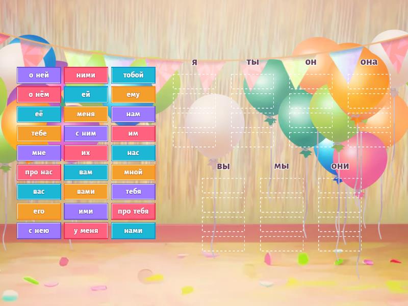 я: мне, мной, меня, у меня, ты: тебя, тебе, тобой, про тебя, он: ему, его, о нём, с ним, она: ей, её, о ней, с нею, вы: вам, вами, вас, мы: нами, нас, нам, про нас, они: им, их, ими, ними,