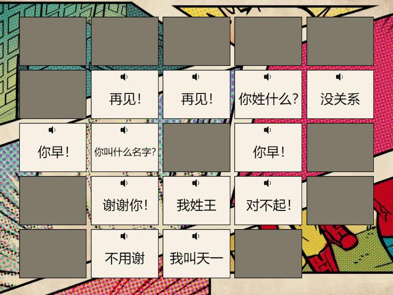 你早! - 你早!, 再见! - 再见!, 没关系 - 对不起!, 不用谢 - 谢谢你!, 我叫天一 - 你叫什么名字?, 我姓王 - 你姓什么?, 我叫有三口人 - 你家有几口人?, 我家有爸爸,妈妈和我 - 你家有谁?, 我没有妹妹 - 你有妹妹吗?, 我十一岁 - 你几岁?, 我喜欢黄色和黑色 - 你喜欢什么颜色?, 我没有校服 - 你有校服吗?,