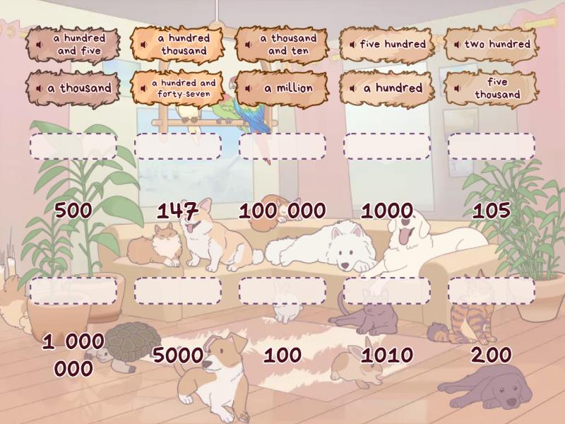 a hundred - 100, a hundred and five - 105, a hundred and forty-seven - 147, two hundred - 200, five hundred - 500, a thousand - 1000, a thousand and ten - 1010, five thousand - 5000, a hundred thousand - 100 000, a million - 1 000 000,