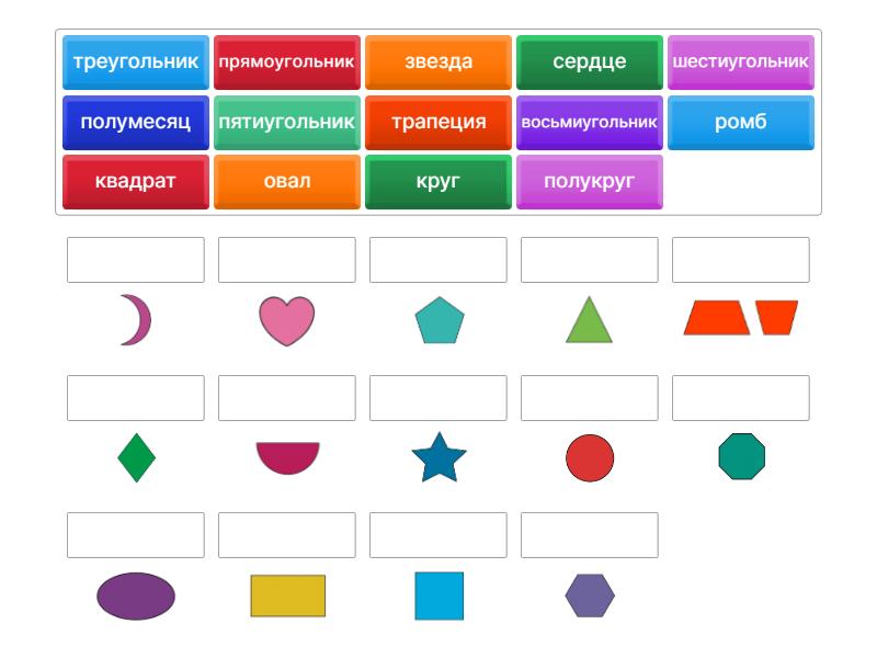 круг, квадрат, овал, прямоугольник, треугольник, трапеция, звезда, сердце, полукруг, полумесяц, пятиугольник, шестиугольник, восьмиугольник, ромб,