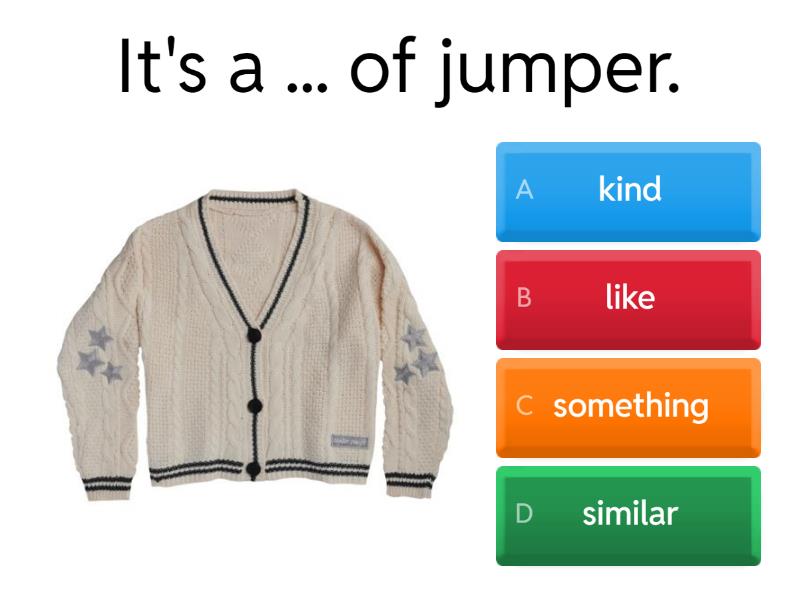 1) It's a ... of jumper. a) kind b) like c) something d) similar 2) It's the ... generous. a) same b) oppposite c) similar d) something 3) It's ... to rent. a) same b) oppposite c) similar d) something 4) It's ... beautiful, but you say it about men. a) similar b) like c) someone d) same 5) It's ... which you buy to remind you of your holiday. a) same b) something c) somebody d) like 6) It's ... where children go to study. a) something b) place c) example d) somewhere 7) You do this in the summer, for ... on the beach. a) like b) example c) same d) somewhere 8) It's ... who works in a restaurant with the clients. a) something b) someone c) example d) like 9) It's ... where you can see a film. a) something b) somewhere c) place d) like 10) It's ... where you can stay in a tent. a) something b) somewhere c) place d) like