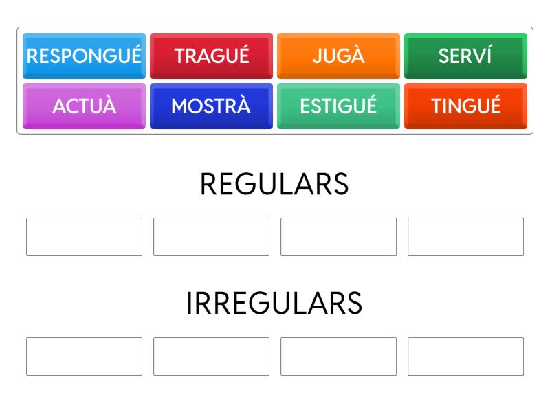 REGULARS: MOSTRÀ, JUGÀ, SERVÍ, ACTUÀ, IRREGULARS: TINGUÉ, ESTIGUÉ, TRAGUÉ, RESPONGUÉ,