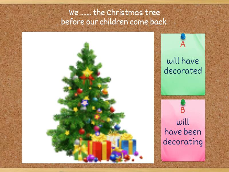 1) We ....... the Christmas tree before our children come back. a) will have decorated b) will have been decorating 2) We ...... in Paris by 5 p.m. a) will have arrived b) will have been arriving 3) Lessons ____ by the time we get there. a) will have been starting b) will have started 4) By 10 o'clock, she ..... TV for 4 hours. a) will have been watching b) will have watched 5) The students ____ their project by Monday. a) will have been finishing b) will have finished 6) ____ lunch when I get home? a) Will you have cooked b) Will you have been cooking 7) Sam ____ the report by 5:00. a) won't have been writing b) won't have written 8) Liz ____ for 3 years by May. a) will have been studying b) will have studied 9) James ____ at the university for more than a year by the time he leaves for Asia. a) will teach b) will have been teaching 10) Sonia buys too many things. She ____ all her money by the end of the month. a) will have spent b) will have been spending