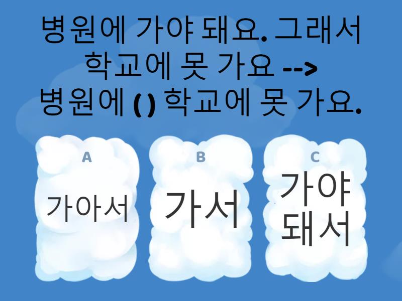 1) ( ) 농구를 못해요. a) 비가 오서 b) 비가 와서 c) 비가 해서 2) 어제 ( ) 일을 못 했어요. a) 아팠서 b) 아프서 c) 아파서 3) 어제 ( ) 수영을 못 했어요. a) 추워서 b) 춥어서 c) 추웠서 4) 어제는 ( ) 전화를 못 받았어요. a) 샤워를 했어서 b) 샤워를 하고 있어서 c) 샤워를 있어서 5) 왜 그 옷을 못 샀어요? a) 비싸서 b) 아파서 c) 싸서 6) 왜 꽃을 못 샀어요? a) 없어서 b) 있어서 c) 사서 7) 왜 아침을 못 먹었어요? a) 가서 b) 자서 c) 늦어서 8) 왜 김 선생님을 못 만났어요? a) 없어서 b) 안 계셔서 c) 있어서 9) 병원에 가야 돼요. 그래서 학교에 못 가요 --> 병원에 ( ) 학교에 못 가요. a) 가아서 b) 가야 돼서 c) 가서