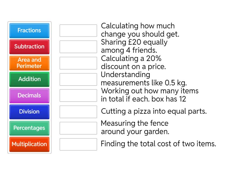 Addition - Finding the total cost of two items., Subtraction - Calculating how much change you should get., Multiplication - Working out how many items in total if each. box has 12, Division - Sharing £20 equally among 4 friends., Fractions - Cutting a pizza into equal parts., Percentages - Calculating a 20% discount on a price., Decimals - Understanding measurements like 0.5 kg., Area and Perimeter - Measuring the fence around your garden.,