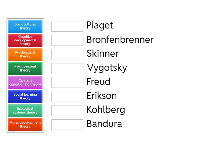 Sociocultural theory - Vygotsky, Psychosexual theory - Freud, Psychosocial theory - Erikson, Moral development theory - Kohlberg, Cognitive developmental theory - Piaget, Social learning theory - Bandura, Operant conditioning theory - Skinner, Ecological systems theory - Bronfenbrenner ,