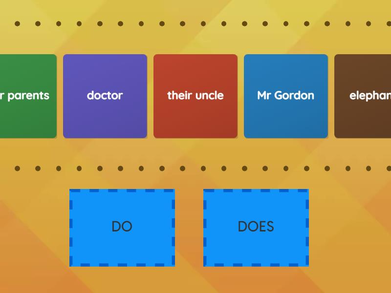 DO: you, we, they, Jim and Bill, your parents, their friends, cats, dogs, elephants, your sisters, our brothers, you and your brother, your grandparents, shops, your hamsters, their teachers, DOES: he, she, it, school, post office, museum, shop, Diana, Mike, Eddie, your sister, your brother, their mum, their uncle, our cat, your dog, Mrs Kay, Mr Gordon, doctor,