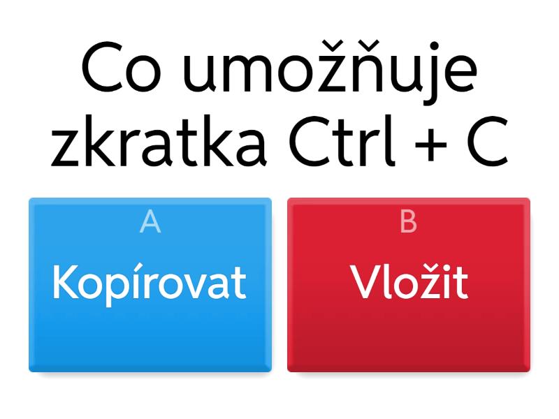 1) Co umožňuje zkratka Ctrl + C a) Kopírovat b) Vložit 2) Jaká z těchto věcí je Hardware a) Firefox b) SSD c) Whatsapp d) Google 3) Co z těchto věcí je Software (více správných odpovědí) a) Projektor b) Firefox c) Discord d) Myš 4) Co není prohlížeč a) Firefox b) Google Chrome c) Opera d) Google 5) Co umožňuje zkratka Ctrl + S a) Uložit b) Tisknout 6) Co umožňuje zkratka Ctrl + W a) Zavřít kartu b) Zavřít okno 7) Co umožňuje zkratka Alt + Tab a) Přepínat mezi kartami b) Prepínat mezi okny c) Zavřít okno d) Napsat @ 8) Kolik znaků by mělo minimálně obsahovat heslo a) 5 b) 7 c) 8 d) 11 9) Které heslo je nejsilnější a) 147258 b) mujpes1 c) P3p@zD3p@ d) pepazdepa 10) Co umožňuje zkratka Alt + F4 a) Zavřít kartu b) Zavřít okno 11) Co není Hardware a) SSD b) Projektor c) Základní deska d) YouTube 12) Co je nejslabší heslo a) Jirka123 b) PesAkim147 c) 123456 d) P3trSv3tr 13) Co je na obrázku a) Procesor b) SSD 14) Co není obrázek a) .jpg b) .gif c) .png d) .css 15) Co umožňuje zkratka Ctrl + N a) Nový dokument b) Obnovit c) Uložit dokument jako d) Zavřít aktuální dokument 16) Své heslo bych měl/a říct a) Rodičům b) Nejlepšímu kamarádovy c) Nikomu d) Všem 17) Na obrázku je a) Základní deska b) Pevný disk 18) Na obrázku je a) Logo Google Pay b) Logo Google Play 19) Na obrázku je a) Logo YT Muzic b) Logo YouTube 20) Na obrázku je a) Síťová karta b) Mikro procesor