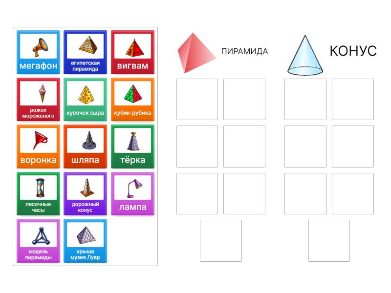 ПИРАМИДА: кубик-рубика, крыша музея Лувр, египетская пирамида, тёрка, кусочек сыра, модель пирамиды, вигвам, КОНУС: песочные часы, воронка, лампа, шляпа, мегафон, дорожный конус, рожок мороженого,