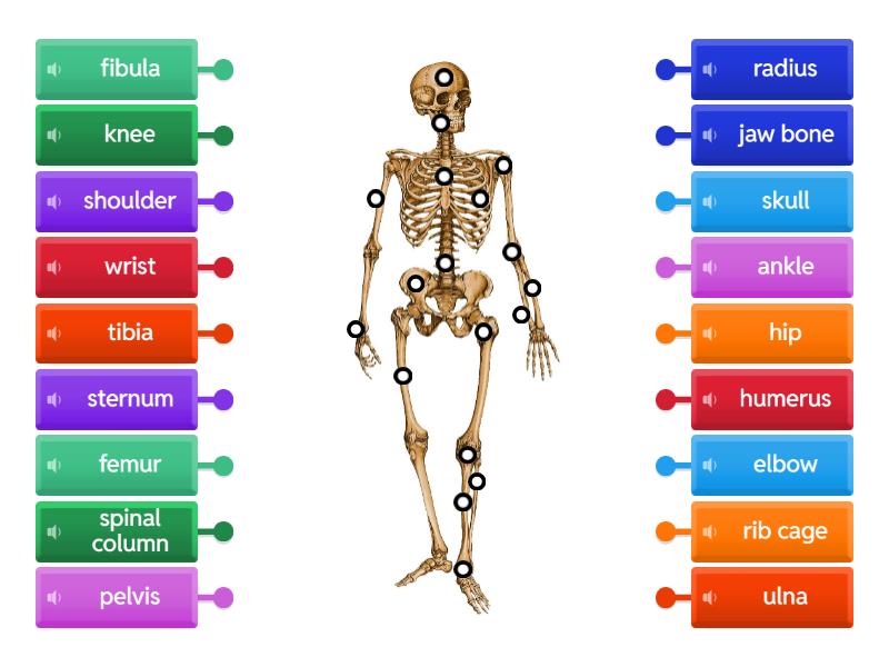 skull, humerus, rib cage, spinal column, pelvis, radius, femur, tibia , shoulder, elbow, wrist, hip, knee, ankle, jaw bone, fibula, ulna, sternum.