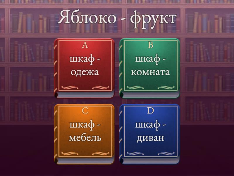 1) Яблоко - фрукт a) шкаф - одежа b) шкаф - комната c) шкаф - мебель d) шкаф - диван 2) Работа - отдых a) свет - луч b) свет - тьма c) свет - день d) свет - лампа 3) Кошка - котёнок a) корова - стадо b) корова - молоко c) корова - животное d) корова - телёнок 4) Дождь - вода a) Нож - сталь b) Нож - лезвие c) Нож - вилка d) Нож - хлеб 5) Овца - шерсть a) Рыба - река b) Рыба - вода c) Рыба - удочка d) Рыба - чешуя 6) Камень - тяяжёлый a) пух - тёплый b) пух - перо c) пух - лёгкий d) пух - мягкий 7) Картина - слепой a) речь - чтец b) речь - глухой c) речь - слышать d) речь - говорящий