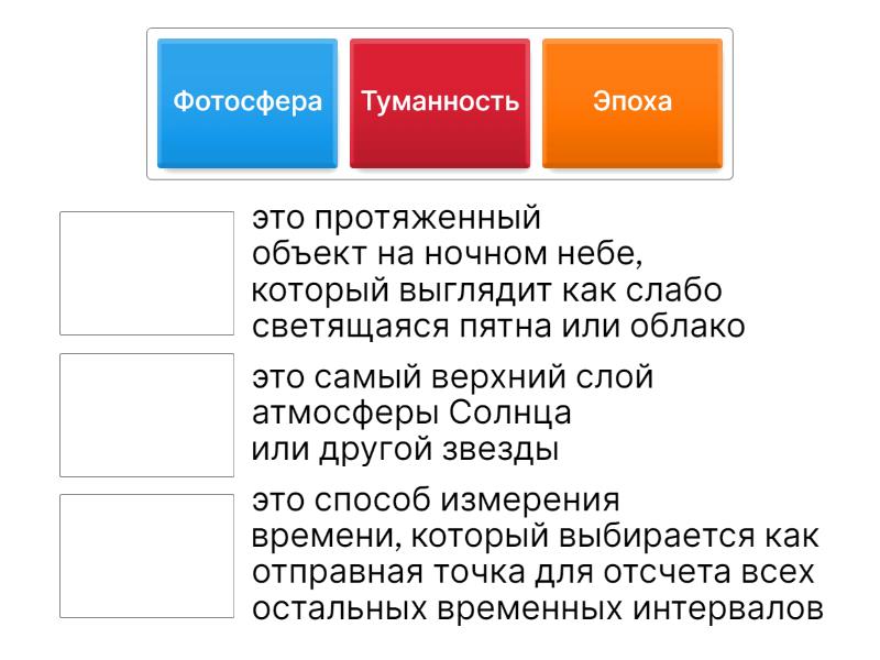 Эпоха - это способ измерения времени, который выбирается как отправная точка для отсчета всех остальных временных интервалов, Фотосфера - это самый верхний слой атмосферы Солнца или другой звезды, Туманность - это протяженный объект на ночном небе, который выглядит как слабо светящаяся пятна или облако,
