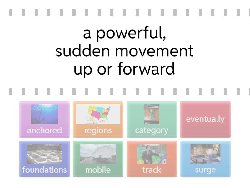 surge - a powerful, sudden movement up or forward, eventually - something will happen at some time, regions - areas, mobile - able to move easily or be moved easily, anchored - strongly attached to something or weighed down, foundations - the base pieces houses and buildings are built upon, category - a group of things that are similar to each other in some way, track - to watch something and see where it moves and how it changes,