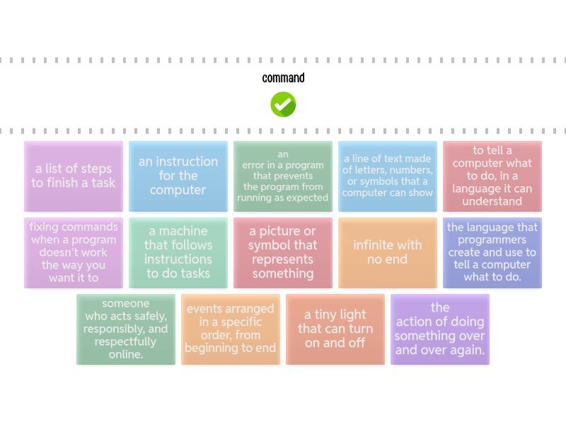 an instruction for the computer, to tell a computer what to do, in a language it can understand, events arranged in a specific order, from beginning to end, an error in a program that prevents the program from running as expected, fixing commands when a program doesn’t work the way you want it to, the language that programmers create and use to tell a computer what to do., a machine that follows instructions to do tasks, a tiny light that can turn on and off, the action of doing something over and over again., a line of text made of letters, numbers, or symbols that a computer can show, a picture or symbol that represents something, infinite with no end, someone who acts safely, responsibly, and respectfully online., a list of steps to finish a task,