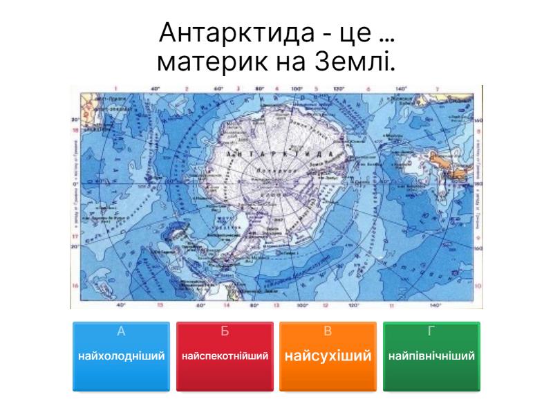 1) Антарктида - це ... материк на Землі. a) найхолодніший b) найспекотнійший c) найсухіший d) найпівнічніший 2) У якій півкулі розташований материк Антарктида ? a) Північній b) Південній 3) Яке місце серед материків  Землі посідає за площею? a) Перше b) П'яте c) Шосте d) Друге 4) Чи є в Антарктиді постійне населення? a) так b) Ні 5) Хто це? a) Імператорський пінгвін b) Аделі c) Золотоволосий d) Королівський 6) Якій державі світу належить Антарктида? a) Франція b) Канада c) Англія d) Жодній 7) Хто це? a) Тюлень b) Морж c) Кит d) Акула 8) Що їдять тюлені? a) Китів b) Рибу c) Кальмарів d) Птахів 9) Які пори року є в Антарктиді? a) Зима b) Весна c) Осінь d) Літо 10) Які океани омивають Антарктиду a) Індійський b) Атлантичний  c) Північний Льодовитий d) Тихий 11) Низька температура в Антарктиді приблизно дорівнює температурі на планеті ...? a) Меркурій b) Венера c) Марс d) Юпітер e) Уран f) Нептун 12) Яка тварина є символом Антарктики? a) синій кит b) тюлень c) білий ведмідь d) пінгвіни