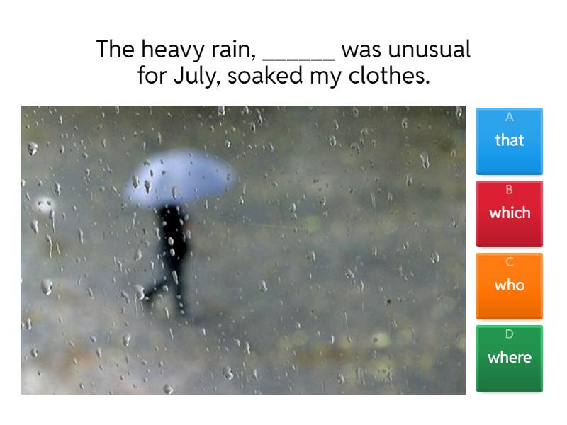 1) The heavy rain, ______ was unusual for July, soaked my clothes. a) that b) which c) who d) where 2) I'm visiting New York, ______ my brother lives, early next year. a) that b) where c) who d) which 3) The latest iPhone, _______ comes out in January, costs a lot of money. a) whose b) where c) who d) which 4) Robert’s parents, .......... are retired now, live in Spain. a) where b) whose c) who d) that 5) Sydney, ............. has a population of more than 3 million, is Australian’s largest city. a) where b) which c) whose d) that 6) Peter’s sister, ............ goes to school with me, is a very nice person. a) who b) where c) which d) that 7) My uncle John, ........... lives in London, is coming to visit me next week. a) where b) which c) that d) who 8) The church, .... we visited yesterday, is very old. a) whose b) which c) when d) where 9) The cafe, ..... the series Friends was filmed, is very expensive. a) when b) that c) which d) where 10) My teacher, ... car has GPS, got lost in New York. a) whose b) that c) which d) when