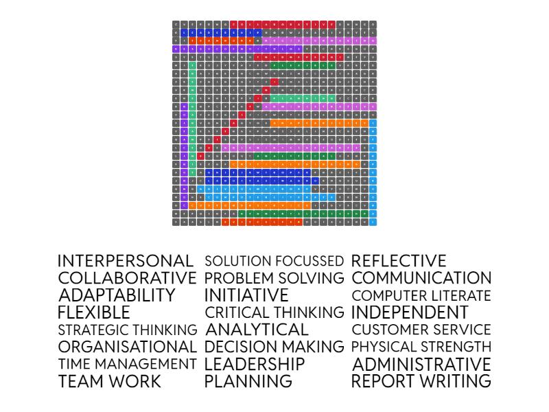 interpersonal , collaborative , adaptability, flexible , strategic thinking, organisational , time management , Team work, solution focussed , problem solving , initiative , critical thinking , analytical, decision making , leadership, planning , reflective , communication, computer literate, independent, customer service , physical strength, administrative , report writing ,