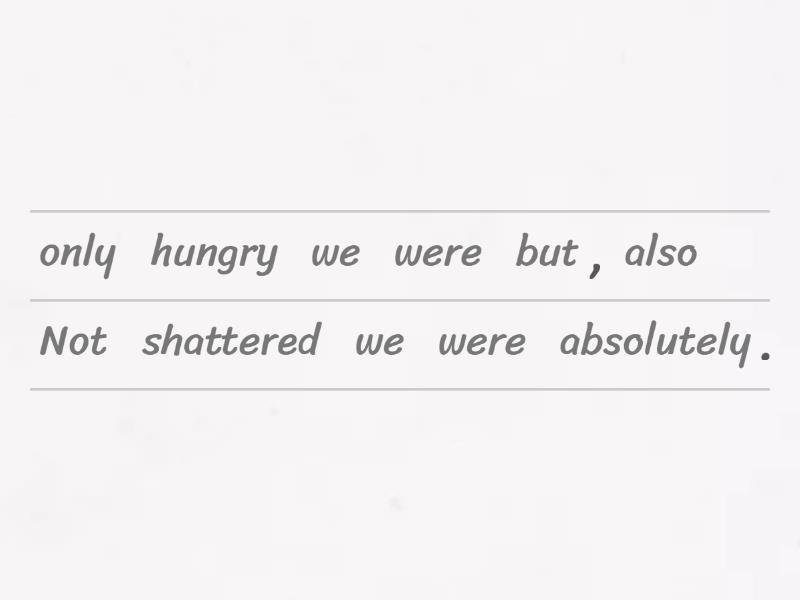 Not only were we hungry, but we were also absolutely shattered., Only then did I understand why they had fallen for each other., Never had she seen such stunning views before., Hardly had I got into bed when the telephone rang., No sooner had we arrived home than the police rang the doorbell., Barely had I finished the first Avengers film before I wanted to watch the sequel. , Not only did the restaurant forget about our booking, but they didn't even apologise., Not until I got home did I realize I had left my wallet at the restaurant., Only by working hard will you achieve your goals., Never have I seen such a creepy movie as Annabelle. , Under no circumstances can you take your mask off. , There she goes!, Should you require any further information,do not hesitate to contact us. , By no means is it easy to use inversion correctly.,