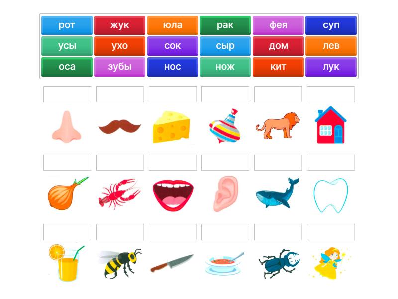 жук, дом, ухо, рак, юла, кит, нож, рот, лев, усы, зубы, сок, суп, фея, сыр, лук, нос, оса,