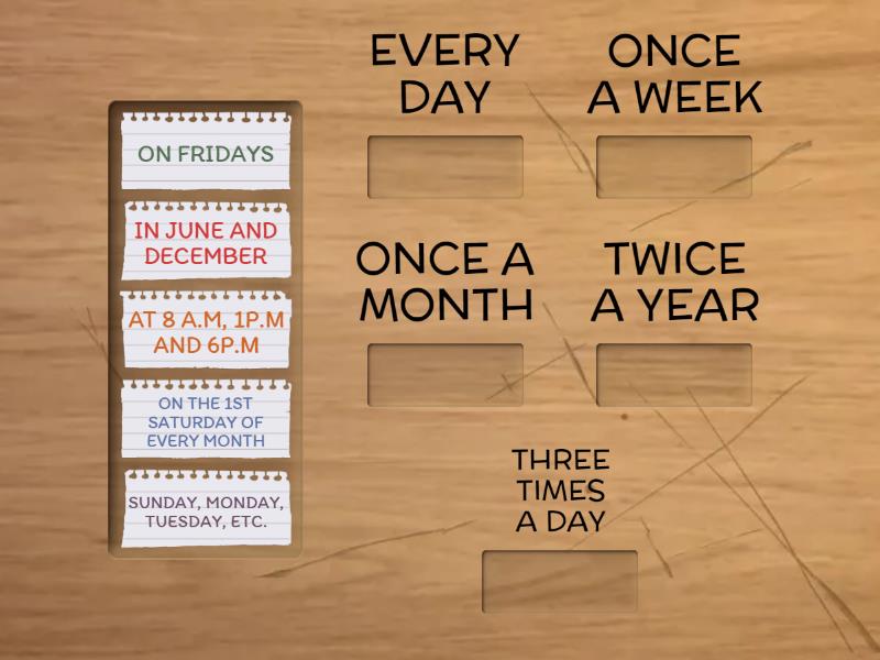 EVERY DAY: SUNDAY, MONDAY, TUESDAY, ETC., ONCE A WEEK: ON FRIDAYS, ONCE A MONTH: ON THE 1ST SATURDAY OF EVERY MONTH, TWICE A YEAR: IN JUNE AND DECEMBER, THREE TIMES A DAY: AT 8 A.M, 1P.M AND 6P.M,