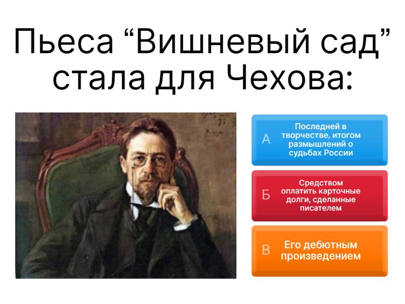 1) Пьеса “Вишневый сад” стала для Чехова: a) Последней в творчестве, итогом размышлений о судьбах России b) Средством оплатить карточные долги, сделанные писателем c) Его дебютным произведением 2) Когда начинается действие пьесы? a) Летом b) Весной c) Зимой 3) Среди героев пьесы нет: a) Вари и Гаева b) Дяди Вани и Ионыча c) Пети и Ани 4) Что угрожает вишневому саду Раневской? a) Вспыхнувший из-за засухи пожар b) Вырубка браконьерами c) Продажа с торгов за долги 5) Какое решение проблемы с вишневым садом предлагает Лопахин Раневской? a) Выйти за него, Лопахина, замуж и воспользоваться его деньгами для покрытия долга b) Поскорее и поудачнее выдать дочерей замуж за богатых женихов c) Сдать территорию сада под дачи и получать с этого прибыль 6) Для всех в семье Раневской вишневый сад крайне важен. Но один человек готов к новой жизни за его пределами. Это a) Сама Раневская b) Варя c) Аня 7) В кого влюбляется Дуняша? a) Петю b) Лопахина c) Яшу, молодого лакея Раневской, привезенного из Парижаа 8) Кем был отец Ермолая Лопахина? a) Помещиком, другом отца Раневской b) Французским послом c) Простым мужиком 9) Кому принадлежит реплика: “Жизнь-то прошла словно и не жил. Я полежу. Силушки-то у тебя нету, ничего не осталось, ничего. Эх ты… недотёпа!”: a) Фирсу, пожилому слуге b) Яше, молодому слуге c) Гаеву Леониду Андреевичу 10) В чём Раневская упрекает Петю Трофимова? a) В неспособности к любви b) За чересчур радикальные политические взгляды c) В чрезмерном увлечении Аней 11) Как автор обозначил жанр пьесы «Вишнёвый сад? a) социальная комедия b) трагедия c) лирическая комедия 12) Какое название в Художественном театре носит характерное для чеховских пьес развитие действия? a) “бурный поток” b) “подводное течение" c) “буря и натиск”