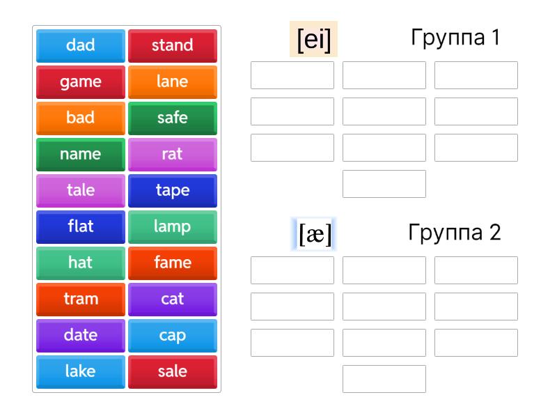 Группа 1: date, name, game, sale, safe, lake, fame, tale, tape, lane, Группа 2: cat, cap, rat, hat, bad, dad, flat, tram, stand, lamp,