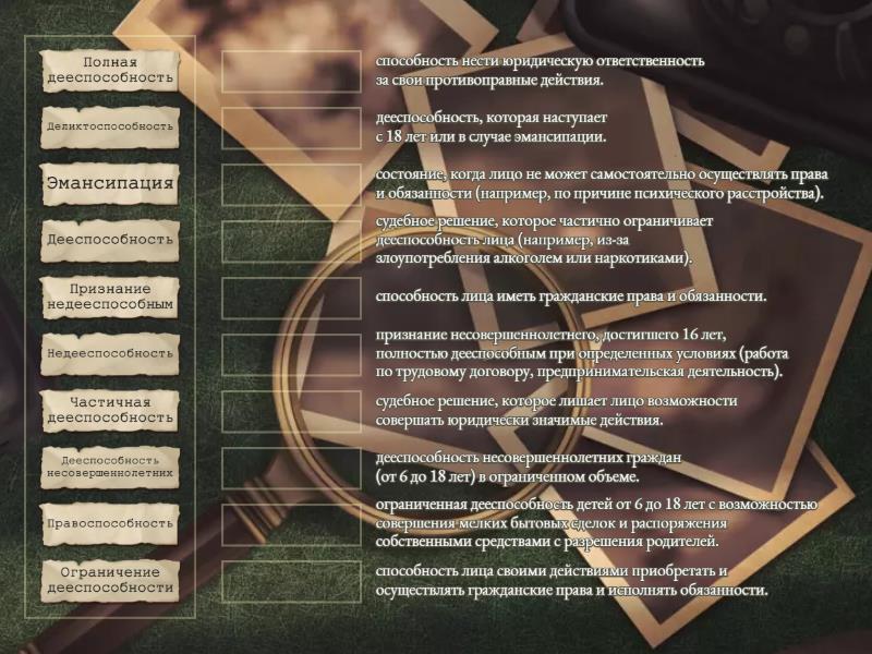 Правоспособность - способность лица иметь гражданские права и обязанности., Дееспособность - способность лица своими действиями приобретать и осуществлять гражданские права и исполнять обязанности., Деликтоспособность - способность нести юридическую ответственность за свои противоправные действия., Эмансипация - признание несовершеннолетнего, достигшего 16 лет, полностью дееспособным при определенных условиях (работа по трудовому договору, предпринимательская деятельность)., Ограничение дееспособности - судебное решение, которое частично ограничивает дееспособность лица (например, из-за злоупотребления алкоголем или наркотиками)., Полная дееспособность - дееспособность, которая наступает с 18 лет или в случае эмансипации., Частичная дееспособность - дееспособность несовершеннолетних граждан (от 6 до 18 лет) в ограниченном объеме., Недееспособность - состояние, когда лицо не может самостоятельно осуществлять права и обязанности (например, по причине психического расстройства)., Признание недееспособным - судебное решение, которое лишает лицо возможности совершать юридически значимые действия., Дееспособность несовершеннолетних - ограниченная дееспособность детей от 6 до 18 лет с возможностью совершения мелких бытовых сделок и распоряжения собственными средствами с разрешения родителей.,