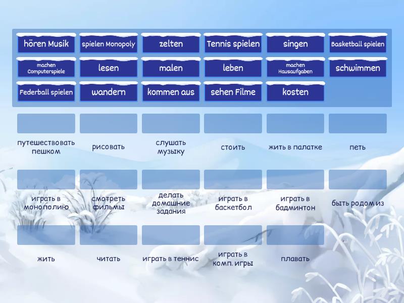 hören Musik - слушать музыку, machen Computerspiele - играть в комп. игры, lesen - читать, sehen Filme - смотреть фильмы, machen Hausaufgaben - делать домашние задания, spielen Monopoly - играть в монополию, malen - рисовать , Basketball spielen - играть в баскетбол, Federball spielen - играть в бадминтон, zelten - жить в палатке, singen - петь, wandern - путешествовать пешком, Tennis spielen - играть в теннис, schwimmen - плавать, kosten - стоить, kommen aus - быть родом из, leben - жить,