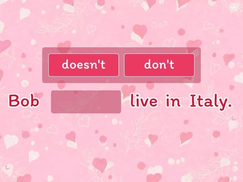 Bob ____ live in Italy. ____ Amanda speak Spanish? ____ your parents get up early? ____ Gabi play football every Friday? My cousins ____ play basketball. ____ you like music? I ____ like chocolate. When ____ the girls go to the swimming pool? ____ Máté and Márk like cars? When ____ the girl meet her friends? What ____ Johanna have for dinner? ____ we have five lessons every day? ____ Áron go home at two o'clock every Monday? Where ____ your teacher have lunch? When ____ you have lunch? Where ____ you meet your friends? When ____ Donát go to the music school? ____ they watch TV in the bedroom? What ____ dad drink in the morning? How often ____ your brothers read books? ____ your brother love milk? ____ your parents get home late? What music ____ your friends listen to? ____ his sister get dressed in her room? ____ you tidy up your room every weekend? We ____ like staying up late. Robert ____ work at a hospital. ____ you play an isntrument? ____ he like sports? I ____ like fish and chips.