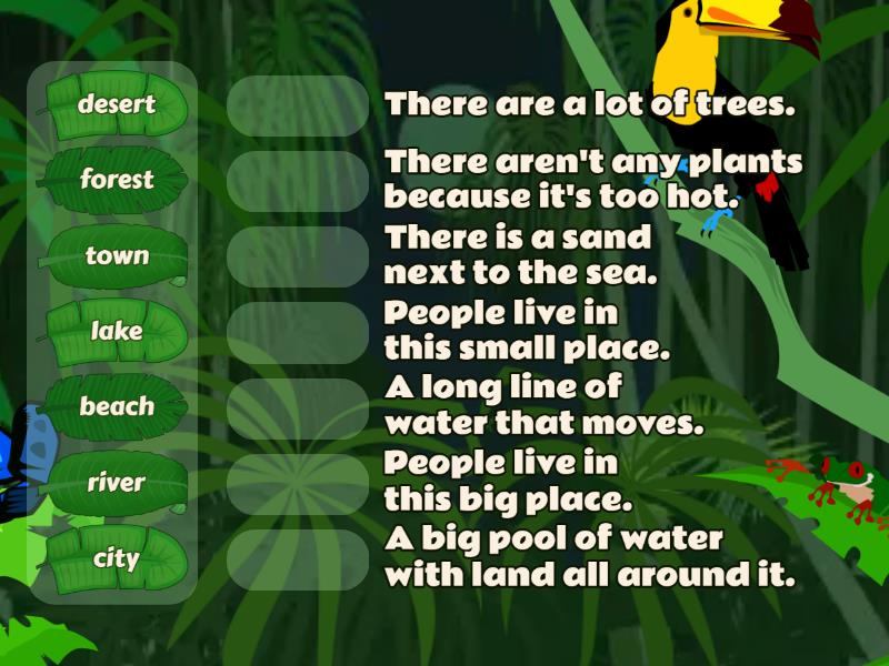 desert - There aren't any plants because it's too hot., forest - There are a lot of trees., town - People live in this small place., beach - There is a sand next to the sea., city - People live in this big place., lake - A big pool of water with land all around it., river - A long line of water that moves.,