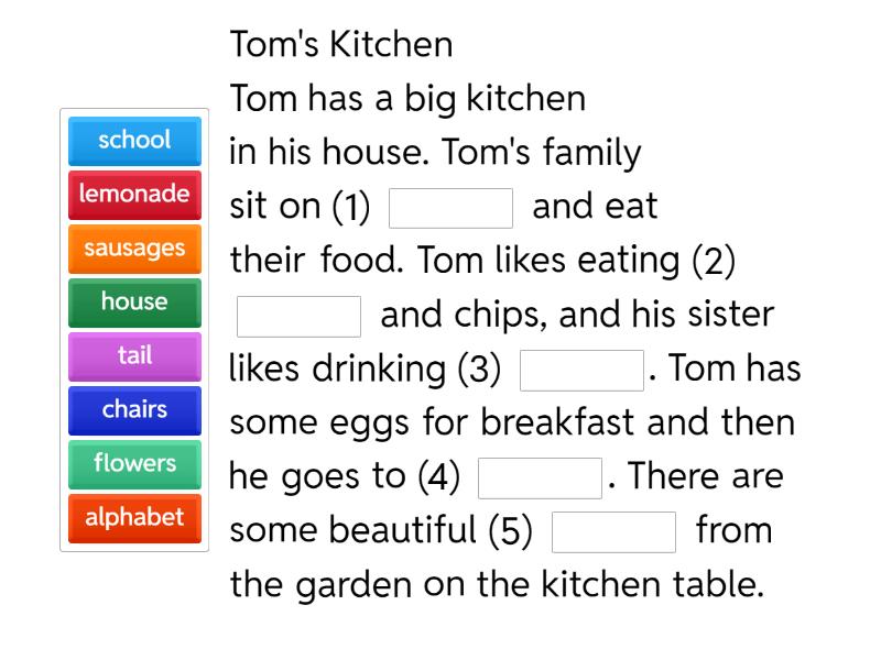 Tom's Kitchen Tom has a big kitchen in his house. Tom's family sit on (1) ____ and eat their food. Tom likes eating (2) ____ and chips, and his sister likes drinking (3) ____. Tom has some eggs for breakfast and then he goes to (4) ____. There are some beautiful (5) ____ from the garden on the kitchen table. A school bus A school bus is big and long. A man or a woman drives it. In the morning you see lots of school buses in the (1) ____ with cars, bikes and (2) ____. The bus stops next to the children’s (3) ____ or flats. The children sit in the bus and put their (4) ____ on the floor. The bus goes to the school and then its (5) ____ opens and the children run to their classrooms! An apple An apple is a fruit, but it’s not like an (1) ____ or a banana. You can find apples in trees in some (2) ____. In winter many (3) ____ like eating apples! People love eating apples too, and drinking their (4) ____. The (5) ____ of apples are red, green or yellow. Does your family enjoy eating apple pie? Pat’s bag Pat’s putting his new book in his school bag. He’s putting his (1) ____ and pencils in his bag too. He’s taking his new tablet to school today. That’s in his bag, and his (2) ____ is too. He draws lines with that. Now he’s putting an (3) ____ for his lunch in his bag, and some fruit (4) ____. That’s his favourite drink but he likes milk too. Pat wears (5) ____ at school. Yes. Those are in his bag too. What’s in your school bag today? A desk A desk has four legs, but it isn’t an animal like a (1) ____ or a zebra. Some children have a desk in their (2) ____. They sit on a (3) ____ and read their favourite (4) ____ there. Some children like putting their crayons, pens, and pencils on their desk. Some children have a (5) ____ on their desk too, and play games on it in the evenings. Giraffes You can see giraffes at the zoo. Giraffes are very big (1) ____. Giraffes have got four long (2) ____, and their tails are very long too. Giraffes see with their big brown (3) ____. They like eating (4) ____, but they don’t eat meat. They drink (5) ____. Their bodies are yellow, orange, and brown. Giraffes are fantastic animals. Do you like giraffes? Monkeys Monkeys live in the trees with their family and friends. Monkeys are fun. They can run and jump with their long (1) ____. They eat fruit but (2) ____ are their favourite food. Lots of monkeys are small but they have long (3) ____. They are brown or orange and have big (4) ____. They have ten fingers and ten (5) ____, like people. Monkeys are very funny! Cats Cats live in houses but they like playing in the (1) ____ with (2) ____. They can be many colours – black, white, brown, grey. They are not very big, they have four legs and a tail and they can run. Lots of cats sleep on a (3) ____ in the hall. They drink (4) ____ and water and they love (5) ____. Cats don’t like dogs! Parks Parks are big with a lot of trees and (1) ____. Lots of parks have a playground. (2) ____ can run and play in parks. They can ride (3) ____ and fly kites in parks. In the trees there are a lot of (4) ____ – black, blue and green. Many parks have water and ducks and children can give food to them. Parks open in the (5) ____ and close in the evening. Televisions People have televisions in their houses. They can be in the bedroom, kitchen or the (1) ____. A television can be on a (2) ____ or a cupboard or on a wall. Televisions can be big or small. A lot of people watch television in the (3) ____. People sit on a (4) ____ or on the floor in front of the television. (5) ____ like watching television and can learn about the world.