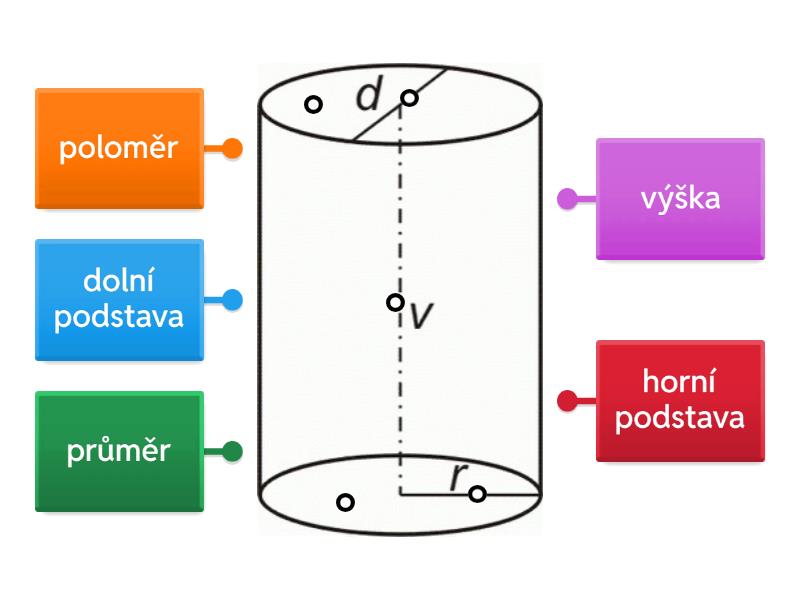 dolní podstava, horní podstava, poloměr, průměr, výška.