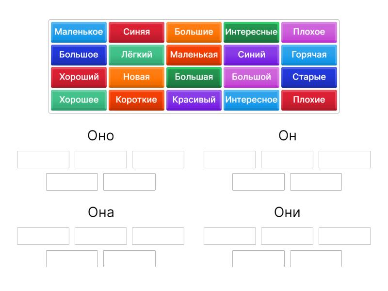 Оно: Интересное, Плохое, Хорошее , Маленькое, Большое, Он: Красивый, Большой, Синий, Хороший, Лёгкий, Она: Новая, Большая, Маленькая, Синяя, Горячая, Они: Старые, Большие, Интересные, Плохие , Короткие,
