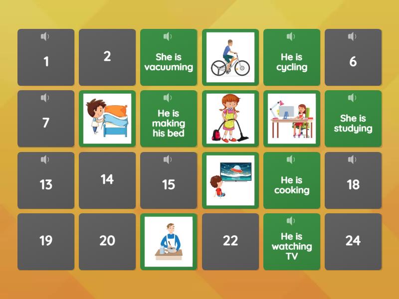 He is cycling, He is cooking, He is making his bed, She is studying, He is watching TV, She is vacuuming, We are reading, They are laughing, She is sleeping, They are watering the plants, They are dancing, He is doing the dishes,