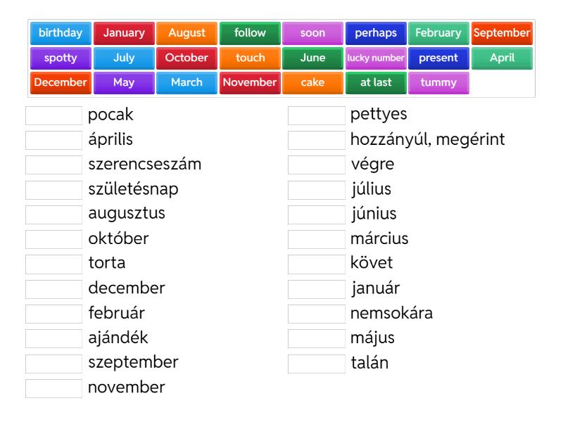 January - január, February - február, March - március, April - április, May - május, June - június, July - július, August - augusztus, September - szeptember, October - október, November - november, December - december, at last - végre, birthday - születésnap, cake - torta, follow - követ, lucky number - szerencseszám, perhaps - talán, present - ajándék, spotty - pettyes, touch - hozzányúl, megérint, soon - nemsokára, tummy - pocak,