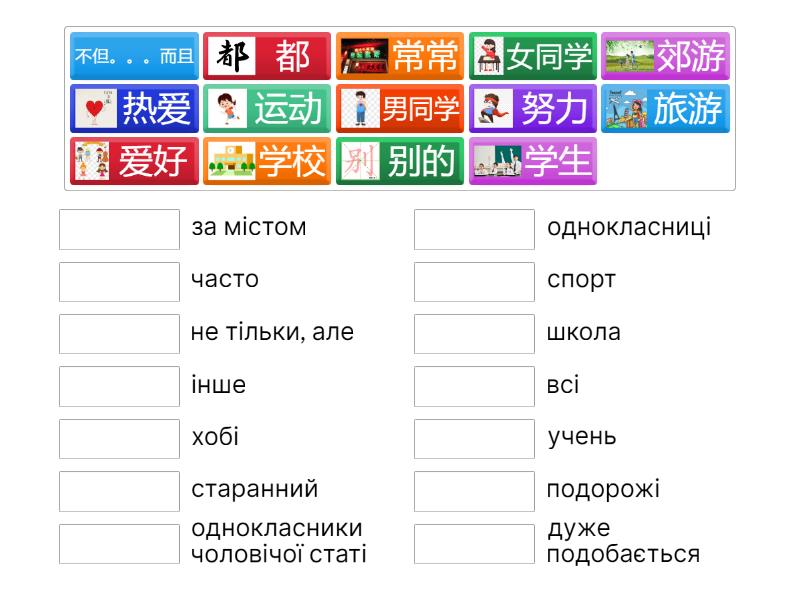 都 - всі, 努力 - старанний, 热爱 - дуже подобається, 不但。。。而且 - не тільки, але , 常常 - часто, 郊游 - за містом, 别的 - інше, 旅游 - подорожі, 男同学 - однокласники чоловічої статі, 女同学 - однокласниці, 运动 - спорт, 爱好 - хобі, 学生 - учень, 学校 - школа,