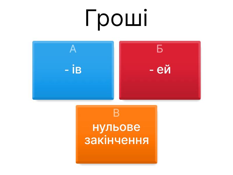 1) Гроші a) - ів b) - ей c) нульове закінчення 2) Ножиці a) - ів b) - ей c) нульове закінчення 3) Окуляри a) - ей b) - ів c) нульове закінчення 4) Гуси a) - ей b) - ів c) нульове закінчення 5) Парфуми a) нульове закінчення b) - ів c) - ей 6) Чоботи a) - ів b) нульове закінчення c) - ей 7) Сани a) - ів b) - ей c) нульове закінчення 8) Ласощі a) - ей b) - ів c) нульове закінчення 9) Іменини a) - ів b) нульове закінчення c) - ей 10) Двері a) - ей b) - ів c) нульове закінчення 11) Сходи a) - ів b) нульове закінчення c) - ей 12) Ворота a) - ей b) нульове закінчення c) - ів 13) Чернівці a) - ей b) нульове c) - ів 14) Суми a) нульове b) - ів c) - ей 15) Черкаси a) - ів b) - ей c) нульове 16) Атени a) - ів b) - ей c) нульове 17) Сіни a) - ей  b) - ів c) нульове 18) Карпати a) нульове b) - ів c) - ей 19) Радощі a) - ей b) - ів c) нульове 20) Канікули a) нульове b) - ів c) - ей