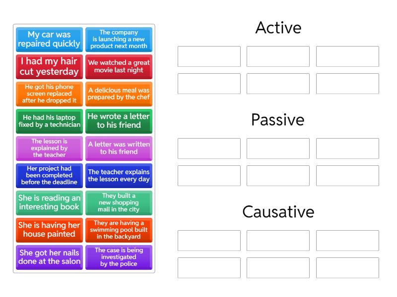Active: They built a new shopping mall in the city, The teacher explains the lesson every day, He wrote a letter to his friend, She is reading an interesting book, We watched a great movie last night, The company is launching a new product next month, Passive: The lesson is explained by the teacher, A letter was written to his friend, My car was repaired quickly, Her project had been completed before the deadline, A delicious meal was prepared by the chef, The case is being investigated by the police, Causative: I had my hair cut yesterday, She is having her house painted, He had his laptop fixed by a technician, She got her nails done at the salon, He got his phone screen replaced after he dropped it, They are having a swimming pool built in the backyard,