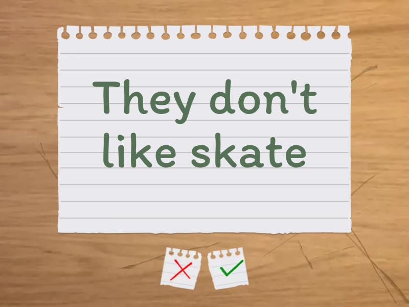 I like layng football - correct, He like playing board games - likeS, We don't like washing the dishes - correct, They don't like skate - skatING, She don't like skateboarding - doesn't, I likes tidying - like, Do you like painting? - correct, Does she likes dancing? - like,