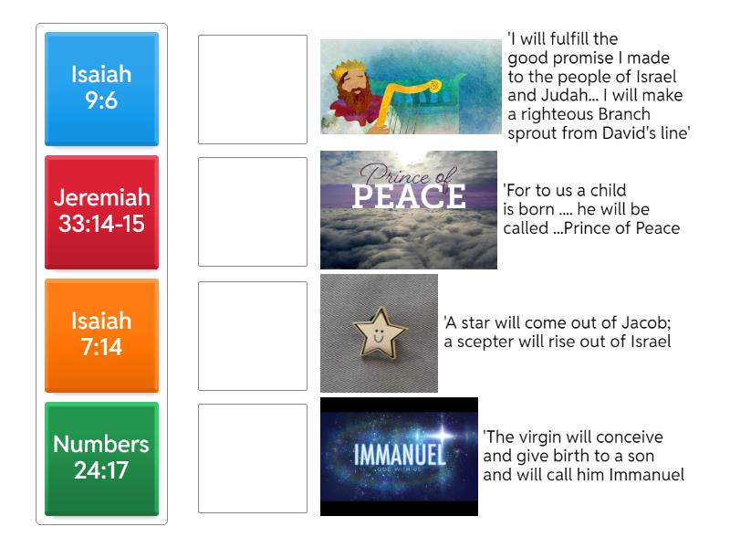 Numbers 24:17 - 'A star will come out of Jacob; a scepter will rise out of Israel, Isaiah 7:14 - 'The virgin will conceive and give birth to a son and will call him Immanuel, Isaiah 9:6 - 'For to us a child is born .... he will be called ...Prince of Peace, Jeremiah 33:14-15 - 'I will fulfill the good promise I made to the people of Israel and Judah... I will make a righteous Branch sprout from David's line',