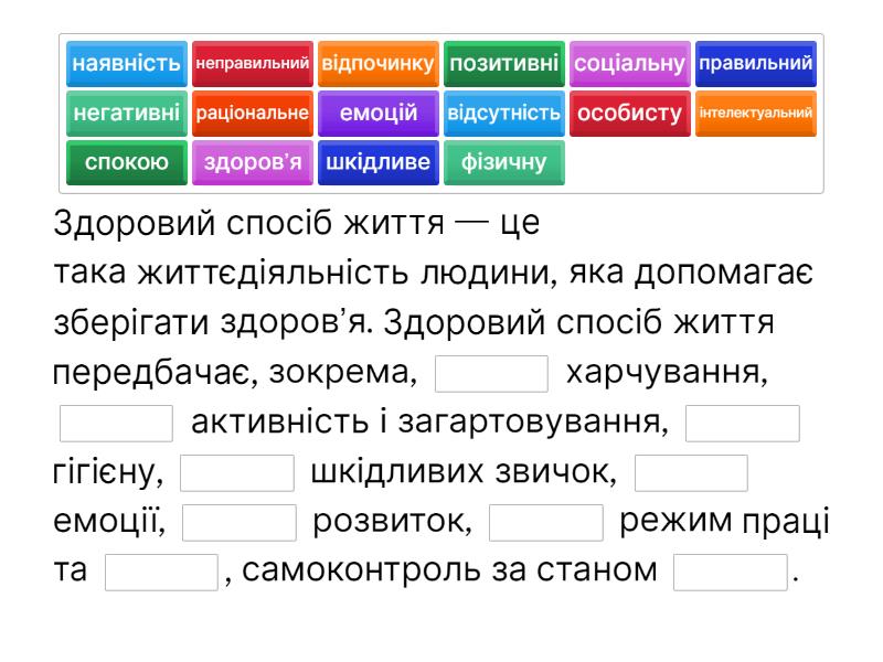 Здоровий спосіб життя — це така життєдіяльність людини, яка допомагає зберігати здоров’я. Здоровий спосіб життя передбачає, зокрема, ____ харчування, ____ активність і загартовування, ____ гігієну, ____ шкідливих звичок, ____ емоції, ____ розвиток, ____ режим праці та ____, самоконтроль за станом ____.