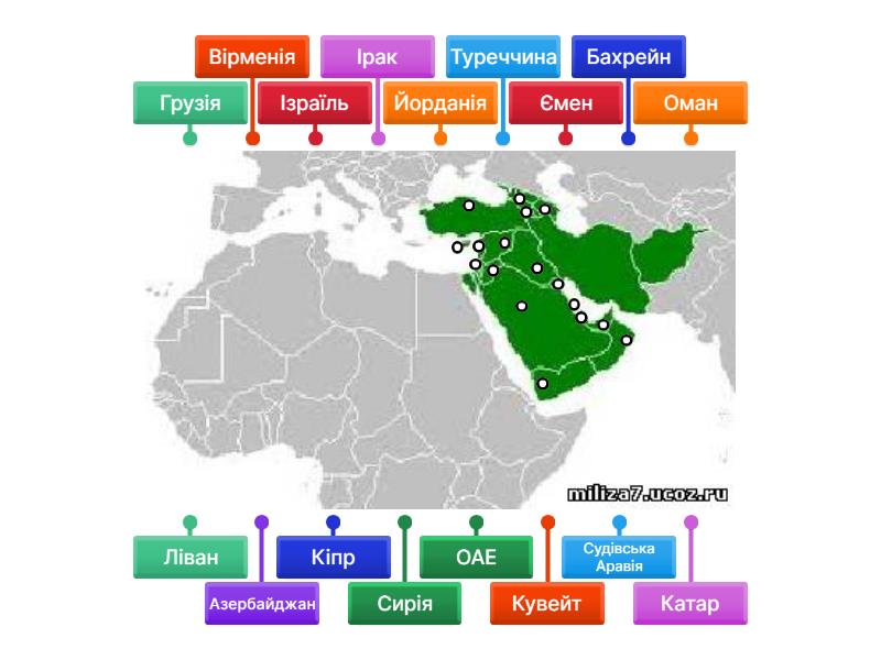 Судівська Аравія, Ємен, Оман, ОАЕ, Катар, Бахрейн, Грузія, Вірменія, Азербайджан, Туреччина, Ізраїль, Йорданія, Сирія, Ірак, Кіпр, Ліван, Кувейт.