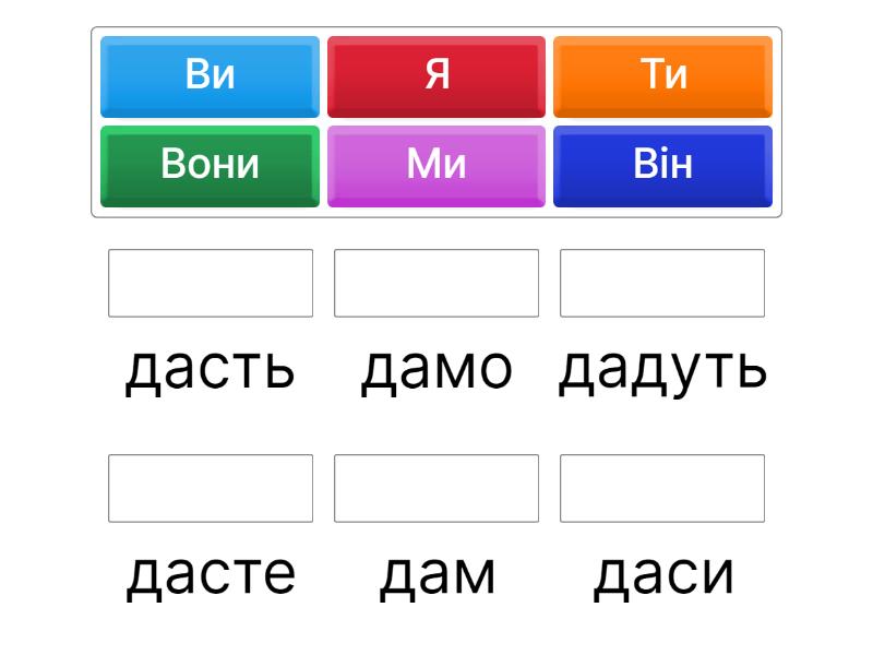 Я - дам, Ти - даси, Він - дасть, Ми - дамо, Ви - дасте, Вони - дадуть,