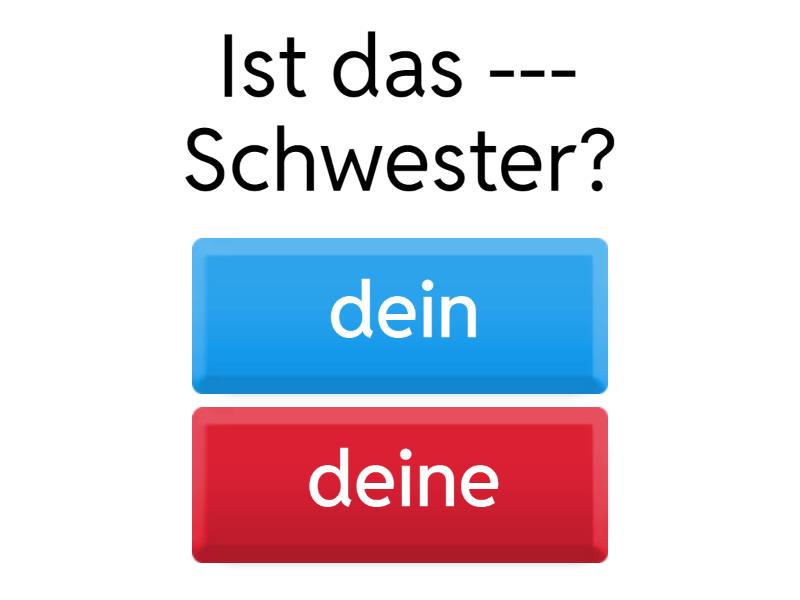 1) Ist das --- Schwester? a) dein b) deine 2) Das sind --- Freunde Jonas und Paul. a) mein b) meine 3) --- Bruder ist okay. a) Mein b) Meine 4) --- Mutter ist 44 Jahre alt. a) Meine b) Mein 5) Wo ist denn --- Heft? a) dein b) deine 6) Ist das --- Block? a) deine b) dein 7) Nein, das ist nicht --- Block. a) mein b) meine 8) Sind das --- Freunde? a) dein b) deine 9) Wo ist --- Freundin? a) deine b) dein 10) Wo sind --- Geschwister? a) deine b) dein 11) Wie alt ist --- Oma? a) dein b) deine 12) Das ist nicht --- Tasche. a) meine b) mein 13) --- Eltern sind nicht zu Hause. a) Mein b) Meine 14) Wie heißt --- Onkel? a) dein b) deine 15) --- Opa spielt gern Monopoly. a) Meine b) Mein 16) --- Cousine wohnt in Wien. a) Meine b) Mein 17) Wo wohnt --- Cousin? a) dein b) deine 18) --- Tante hat zwei Kinder. a) Mein b) Meine
