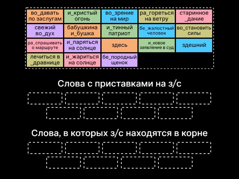 Слова с приставками на з/с: и_жариться на солнце, во_зрение на мир, бе_породный щенок, во_давать по заслугам, бе_жалостный человек, ра_гореться на ветру, ра_спрашивать о маршруте, и_паряться на солнце, во_становить силы, Слова, в которых з/с находятся в корне: и_кристый огонь, лечиться в _дравнице, бабушкина и_бушка, и_ковое заявление в суд, и_тинный патриот, старинное _дание, свежий во_дух, здесь, здешний,