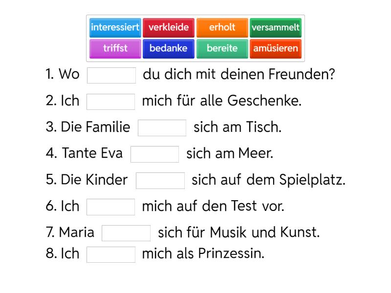 1. Wo ____ du dich mit deinen Freunden? 2. Ich ____ mich für alle Geschenke. 3. Die Familie ____ sich am Tisch. 4. Tante Eva ____ sich am Meer. 5. Die Kinder ____ sich auf dem Spielplatz. 6. Ich ____ mich auf den Test vor. 7. Maria ____ sich für Musik und Kunst. 8. Ich ____ mich als Prinzessin.