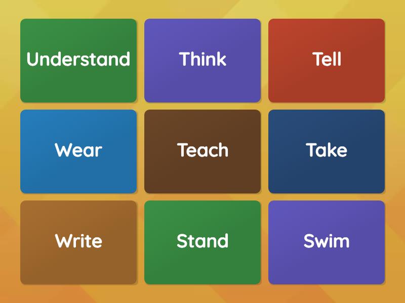 Stand - stood - stood, Swim - swam - swum, Take - took - taken, Teach - taught - taught, Tell - told - told, Think - thought - thought, Understand - understood - understood, Wear - wore - worn, Write - wrote - written,