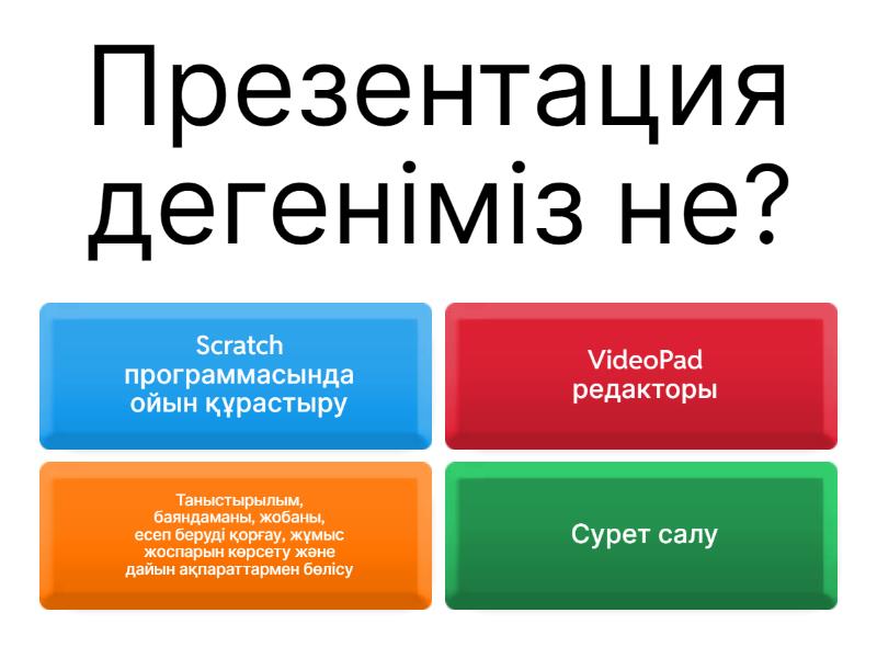 1) Презентация дегеніміз не? a) Scratch программасында ойын құрастыру b) VideoPad редакторы c) Таныстырылым, баяндаманы, жобаны, есеп беруді қорғау, жұмыс жоспарын көрсету және дайын ақпараттармен бөлісу d) Сурет салу 2) MS PowerPoint программасын іске қосу үшін? a) Пуск-Стандартные-Microsoft PowerPoint b) Пуск-Все программы-Microsoft Office-Microsoft PowerPoint c) Пуск-Все программы-Стандартные-Блокнот d) Пуск-Все программы-Microsoft Word 3) PowerPoint программасын қандай компания жасаған? a) Samsung b) Apple c) Microsoft d) Google 4) Презентацияға арналған ақпараттардың көп бөлігін қайдан аламыз? a) Интернеттен b) Дәптерден c) Қоршаған ортадан d) Адамдардан 5) Жүктелген файлдарды қайдан көруге болады? a) Загрузки бөлімінен b) Документы бөлімінен c) Локальный диск С d) Локальный диск Д