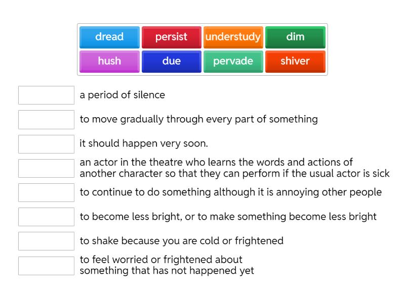 dim - to become less bright, or to make something become less bright, hush - a period of silence, dread - to feel worried or frightened about something that has not happened yet, pervade - to move gradually through every part of something, understudy - an actor in the theatre who learns the words and actions of another character so that they can perform if the usual actor is sick, shiver - to shake because you are cold or frightened, persist - to continue to do something although it is annoying other people, due - it should happen very soon.,
